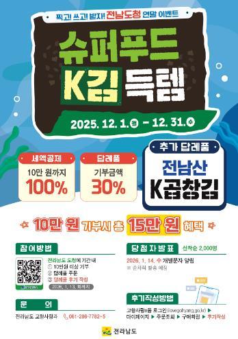 [한국제일신문, 윤진성기자] 전라남도가 연말을 맞아 고향사랑기부제 참여 확대와 지역 수산물 소비 촉진을 위해 슈퍼푸드 케이(K)김을 활용한 대규모 연말 이벤트를 진행한다.