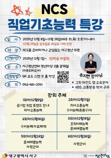 'NCS(국가 직무능력 표준) 직업 기초 능력 특강'은 선착순으로 모집하며, 12월 9일부터 12월 26일까지 매주 화요일과 목요일 오후 7시부터 9시까지 총 6회차로 진행된다. 대구 서구에 주소를 둔 19세 이상 39세 이하의 NCS(국가 직무능력 표준)를 준비하거나 관심 있는 청년 누구나 참여할 수 있으며, 참여를 희망하는 청년은 모집 포스터에 안내된 QR코드(정보 무늬 코드)를 통해 신청할 수 있다.