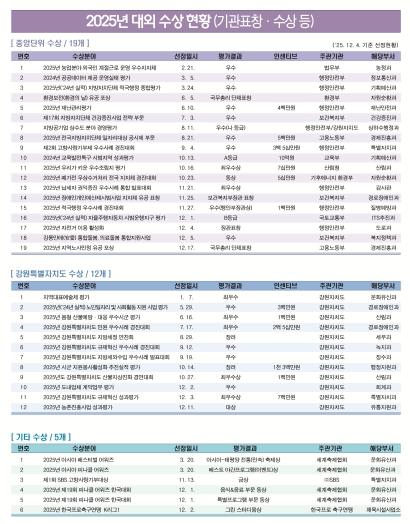 김홍규 강릉시장은 “2025년 수상 실적은 시민 중심 행정이 만든 성과이며, 강원제일 행복강릉 실현을 위해 앞으로도 5대 시정목표를 중심으로 경제, 관광, 문화·예술·교육, 농어업, 복지 등 모든 분야에서 지속적인 혁신을 이어나가겠다.”고 말했다.