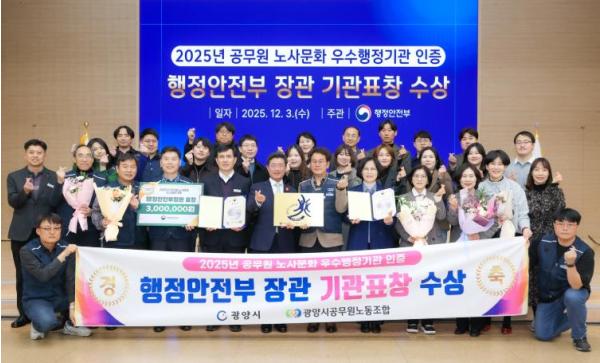 [한국제일신문, 윤진성기자] 광양시가 행정안전부가 주관한 ‘2025년 공무원 노사문화 우수행정기관 인증제’ 심사에서 우수행정기관으로 선정돼 행정안전부장관 표창을 수상했다.