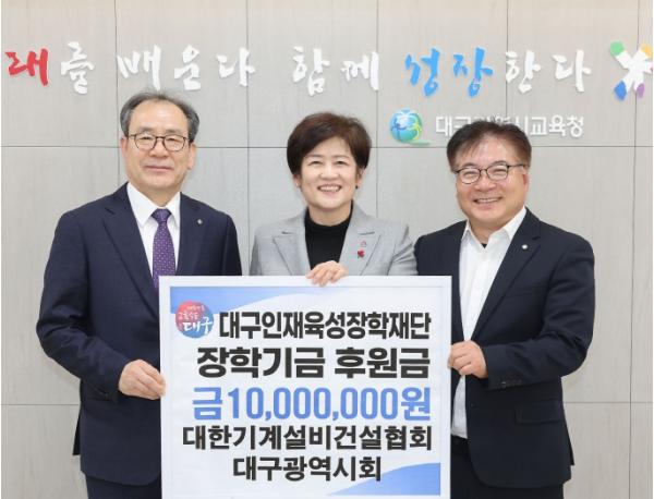 [한국제일신문, 김성옥기자] 대구시교육청은 12월 4일, 대한기계설비건설협회 대구광역시회(회장 이민균)에서 대구인재육성장학재단에 장학금 1천만 원을 기탁했다고 밝혔다.