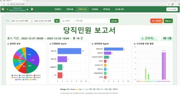 이 시스템은 김포시 정보통신과 전성철 주무관이 생성형 AI 기술을 적극 활용해 웹서버 구축부터 데이터베이스 아키텍처 설계, 기능 개발, 정보보안 기술 적용, UI‧UX 디자인까지 전 과정을 단독 수행하며 개발한 공공분야 자체개발 당직민원처리 시스템의 선도적 사례다.