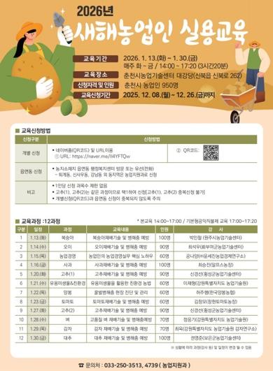 [한국제일신문, 김성옥기자] 춘천시가 내년 농업 현장에서 필요한 신기술을 집중 교육하는 2026년 새해농업인실용교육을 운영한다.