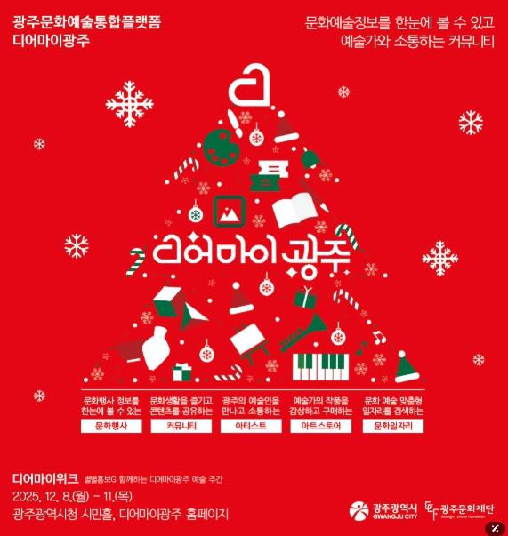 [한국제일신문, 윤진성기자] 광주문화예술통합플랫폼 ‘디어마이광주’의 오프라인 축제 ‘디어마이위크’가 12월 8일부터 11일까지 광주광역시청 1층 로비에서 열린다. 올해 축제는 광주광역시 홍보 성과 공유회 ‘2025 별별홍보G’와 연계하여, 문화예술을 기반으로 한 새로운 지역 홍보 모델을 제시하는 데 의미를 두고 있다.