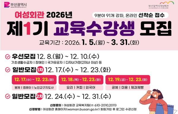 [한국제일신문, 김성옥기자] 부산시 여성회관은 내일(8일)부터 '2026년 제1기 교육과정' 수강생을 모집한다고 밝혔다.