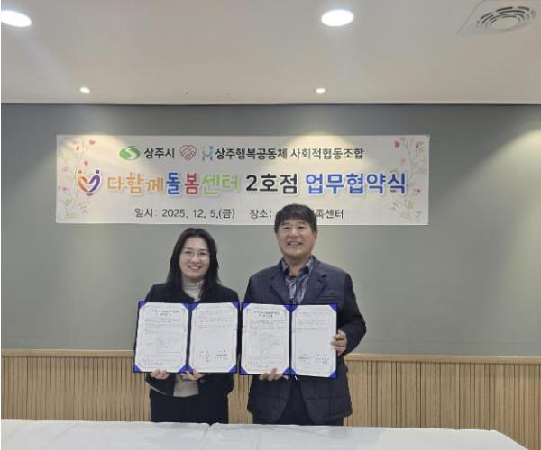 [한국제일신문, 김성옥기자] 상주시는 12월 5일 상주시가족센터에서 상주시 다함께돌봄센터 2호점 위수탁 협약식을 개최하고, 수탁기관으로 상주행복공동체 사회적협동조합을 최종 선정하여 협약을 체결했다.