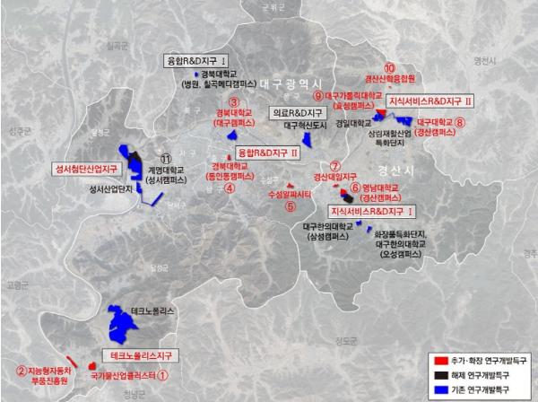 융합R·D지구에는 지역 AX(인공지능 전환) 혁신 기술 거점인 수성알파시티를 편입해 기업의 디지털 전환(DX)과 산업 융복합을 촉진하고, 대경권 유일의 연구중심병원인 경북대학교 동인캠퍼스를 추가해 의료바이오 분야 연구개발 및 기술사업화를 확대할 예정이다.