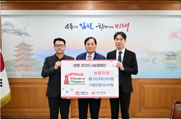 [한국제일신문, 김성옥기자] 김천시은 지난 5일, ㈜위드엔지니어링(대표 임은호)으로부터 희망2026나눔캠페인 성금 1,000만 원을 전달받았다고 밝혔다.