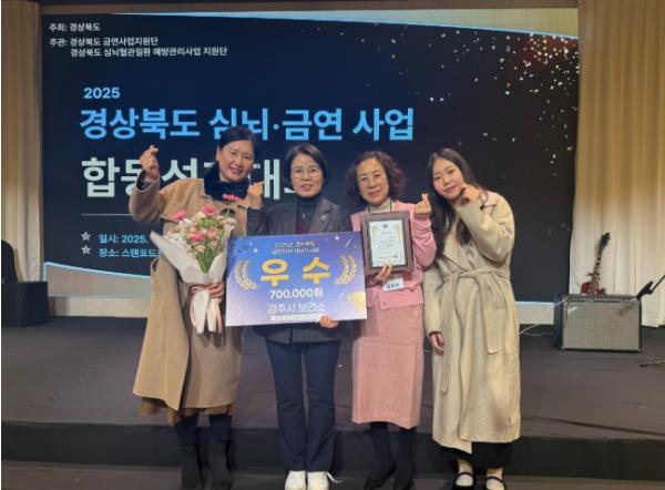 [한국제일신문, 김성옥기자] 경주시보건소는 지난 5일 스탠포드호텔 안동에서 열린 ‘2025년 경상북도 심뇌혈관·금연사업 합동 성과대회’에서 금연지원서비스사업 부문 우수상을 수상했다고 밝혔다.