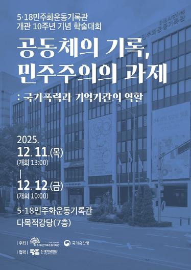 [한국제일신문, 윤진성기자] 광주광역시 5‧18민주화운동기록관은 국가유산청과 함께 오는 11~12일 이틀간 기록관에서 ‘공동체의 기록, 민주주의의 과제 : 국가폭력과 기억기관의 역할’을 주제로 개관 10주년 기념 학술대회를 개최한다.