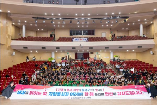 [한국제일신문, 김성옥기자] 칠곡군은 지난 3일 칠곡군 왜관읍에 위치한 칠곡군 교육문화회관에서 ‘감동의 봉사, 희망의 칠곡군으로 빛나다’라는 주제로 김재욱 칠곡군수, 이상승 칠곡군의회 의장을 비롯한 주요 기관단체장과 자원봉사자 700여명이 참석한 가운데‘2025년 칠곡군 자원봉사자 대회’를 개최했다.