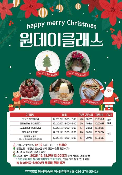 [한국제일신문, 김성옥기자] 포항시 평생학습원 여성문화관은 오는 12일부터 ‘겨울단기강좌’와 ‘원데이클래스’ 수강생을 모집한다.