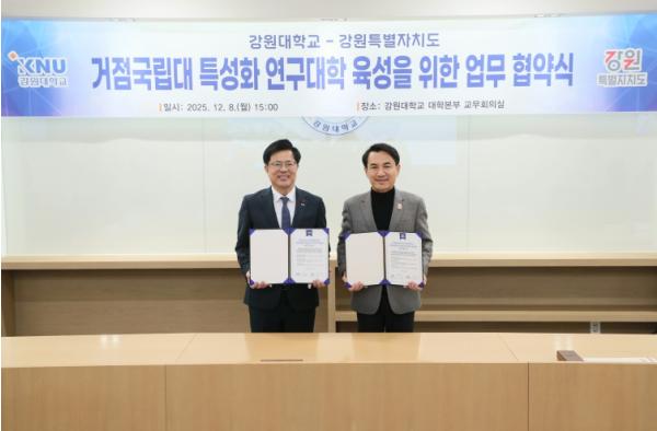[한국제일신문, 김성옥기자] 강원특별자치도는 12월 8일 강원대학교 대학본부 3층 교무회의실에서 강원대학교와'거점국립대 특성화 연구대학 육성을 위한 업무협약'을 체결했다고 밝혔다.