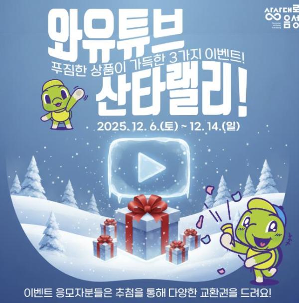 [한국제일신문, 김성옥기자] 음성군은 ‘와유튜브 산타랠리 이벤트’를 이달 14일(23시)까지 진행한다고 밝혔다.