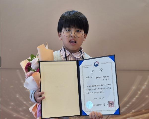 [한국제일신문, 김성옥기자] 영월군청소년문화의집 소속 박우슬(옥동초 3) 청소년이'2025년 청소년성취포상제 우수사례 공모전'자기도전 부문에서 성평등가족부 장관상(최우수상)을 받는 영예를 안았다.