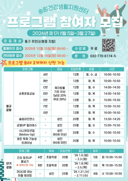 [한국제일신문, 김성옥기자] 인천 동구 송림건강생활지원센터는 지역 주민의 건강 증진과 생활 습관 개선을 위한 ‘2026년 제1기 프로그램 참여자’를 모집한다고 밝혔다.