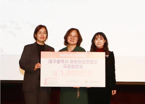 - 박윤희 대구광역시 청년여성교육국장은 “우리 지역 국공립어린이집은 늘 아이들의 하루를 책임지며, 부모님이 안심하고 아이를 맡길 수 있도록 매 순간 최선을 다해왔다. 그 노력과 헌신이 모여 대구시 보육에 대한 신뢰를 높일 수 있었다”며, “국공립어린이집 원장님들의 따뜻한 성금 기탁에 진심으로 감사드린다”고 말했다.