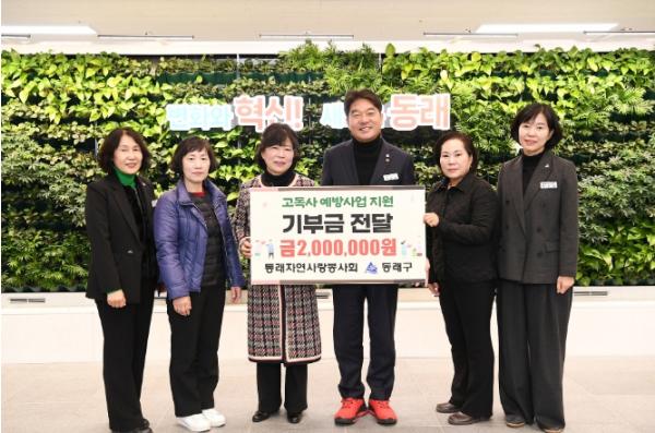 [한국제일신문, 김성옥기자] 부산 동래구는 지난 8일 동래자연사랑봉사회(회장 김영미)로부터 연말을 맞아 관내 고독사 예방 사업 지원을 위한 기부금 200만 원을 전달받았다고 밝혔다.