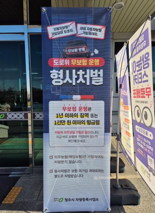 청주시는 ‘무보험운행은 형사처벌’을 홍보하기 위해 차량등록사업소 입구에 안내 배너를 설치했으며, 의무보험 가입 홍보물을 제작해 시청·구청·읍·면·동·경찰서 민원실과 교통안전공단 및 운전면허시험장, 충청북도 교통연수원, 청주출입국외국인사무소 등에 배부했다.