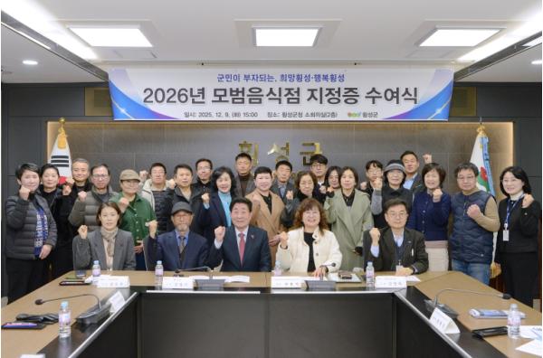 [한국제일신문, 김성광기자] 횡성군보건소는 9일 횡성군청 소회의실에서 ‘2026년도 모범음식점 지정증 수여식 및 이웃사랑 성금 전달식’을 가졌다. 올해 모범음식점은 재지정 29개소와 신규 1개소를 포함해 총 30개 업소가 지정됐다.
