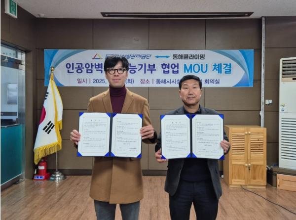 [한국제일신문, 김성옥기자] 동해시시설관리공단은 12월 9일 11시, 웰빙레포츠타운 종합경기장 2층 회의실에서 관내 클라이밍 동아리‘동해클라이밍’과 인공암벽장 재능기부 협업을 위한 업무협약(MOU)을 체결했다.