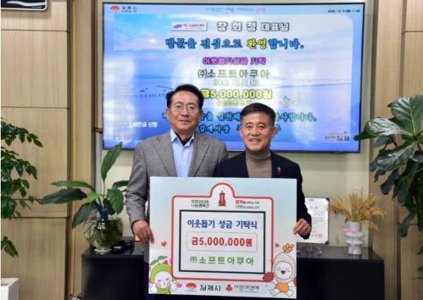 [한국제일신문, 이미란기자] 김제시는 (주)소프트아쿠아(대표 장희정)가 지난 9일 관내 취약계층을 돕기 위한 성금 500만원을 기탁했다고 밝혔다.