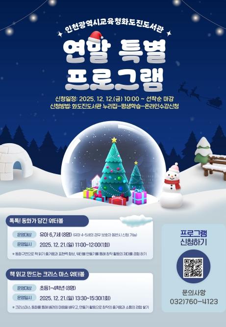 [한국제일신문, 김성옥기자] 인천광역시교육청화도진도서관은 12월 21일부터 유아와 초등학생을 대상으로 ‘2025년 연말 특별프로그램’을 운영한다.
