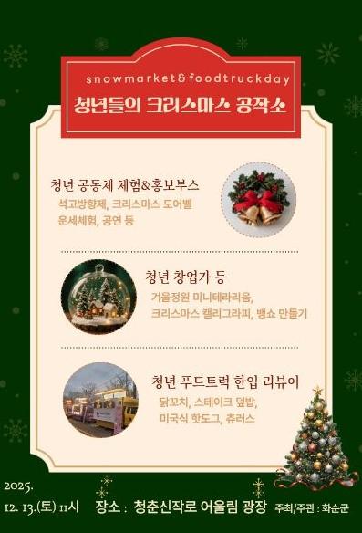 [한국제일신문, 윤진성기자] 화순군은 오는 12월 13일 오전 11시부터 화순읍 청춘신작로 어울림광장에서 청년들의 크리스마스 공작소를 개최한다고 밝혔다.