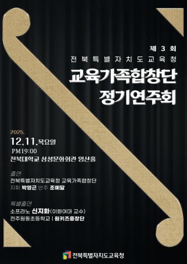 [한국제일신문, 윤진성기자] 전북특별자치도교육청은 오는 11일 오후 7시 전북대학교 삼성문화회관에서 ‘제3회 전북특별자치도교육청 교육가족합창단(이하 교육가족합창단) 정기연주회’를 개최한다고 밝혔다.