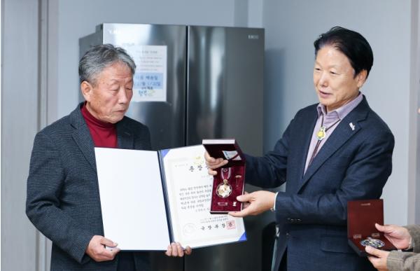[한국제일신문, 김성옥기자] 성주군은 12월 9일, 초전면 문치경로당에서 6·25전쟁 당시 강원 양구지구 전투에서 공훈을 세운 故 이득기님에 대한 화랑무공훈장 전수식을 가졌다.