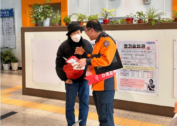 [한국제일신문, 윤진성기자] 전북특별자치도소방본부는 10일 익산역 대합실에서 119안심콜 서비스와 화재대피안심콜의 가입 촉진을 위한 홍보 캠페인을 진행했다고 밝혔다.