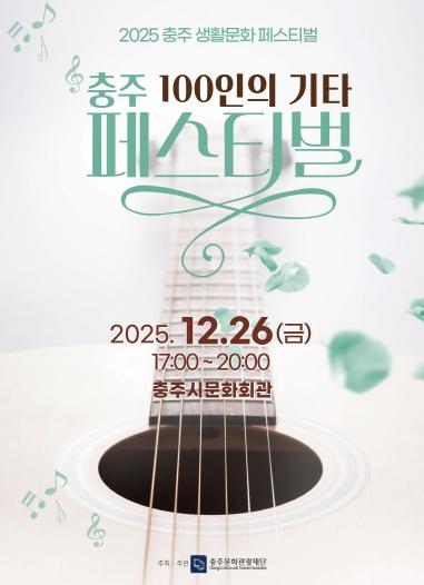 (재)충주문화관광재단은 오는 12월 26일 충주시문화회관에서‘충주 100인의 기타 페스티벌’을 개최한다고 밝혔다. 이번 페스티벌은 충주 지역의 기타동아리들이 한자리에 모여 기타의 아름다운 선율을 시민들에게 선보이는 자리로, 통기타와 클래식기타를 모두 아우르는 공연 구성이 특징이다.