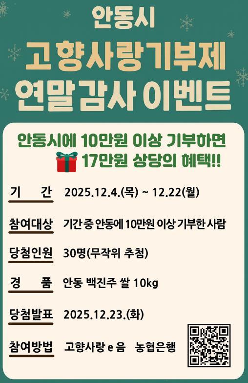[한국제일신문, 김성옥기자] 안동시는 연말정산 시즌을 맞아, 고향사랑기부제 참여자에게 감사의 뜻을 전하고 기부 문화를 확산하기 위해 12월 22일(월)까지 ‘안동시 고향사랑기부제 연말 감사 이벤트’를 진행한다고 밝혔다.