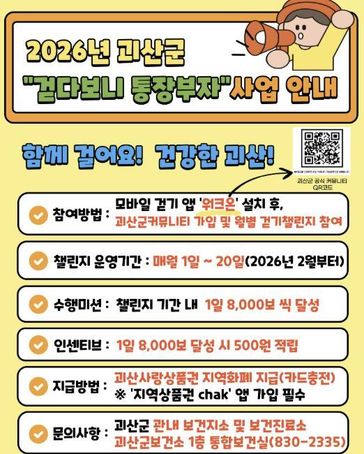 [한국제일신문, 김성옥기자] 충북 괴산군은 군민의 건강 증진과 걷기운동 활성화를 위해 2026년부터 ‘걷다보니 통장부자’ 사업을 추진한다고 11일 밝혔다.