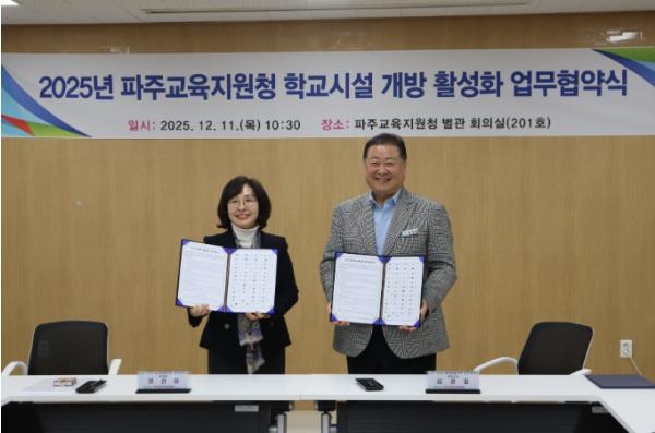 전선아 파주교육지원청 교육장은 “이번 협약을 계기로 학교와 지역사회가 한층 더 긴밀히 협력하며, 지역 주민들의 학교시설 이용에 큰 도움이 될 것으로 기대한다”며 “앞으로도 학교시설 개방이 안정적으로 정착될 수 있도록 지속적인 지원과 관심을 다하겠다”고 밝혔다.