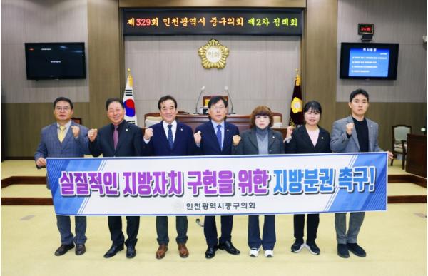 이어 중구의회는 지방정부가 지역 실정에 부합하는 정책을 자율적으로 수립·시행할 수 있도록 관련 제도를 개선하고 중앙정부가 권한 이양을 적극 추진해야 한다고 밝혔다. 아울러 중앙의 승인 중심 행정관행을 개선해 지방의 정책결정권을 보장하고, 지방세 확충 및 지방교부세 개선 등 조세제도 개편을 통해 지방정부의 재정자주도를 높이는 것이 필요하다고 강조했다. 국세·지방세 비율 또한 합리적으로 조정해 지방정부가 자주재원을 바탕으로 필요한 사업을 안정적·자율적으로 추진할 수 있는 여건을 마련해야 한다고 덧붙였다. 또한 중앙정부와 국회가 지방정부의 자치입법권·자치조직권·자치재정권을 명시하고 지방분권을 보장하며, 국가사무의 지방 이양 및 권한 배분 원칙을 명문화하는 지방분권형 개헌을 추진해야 한다고 강조했다.