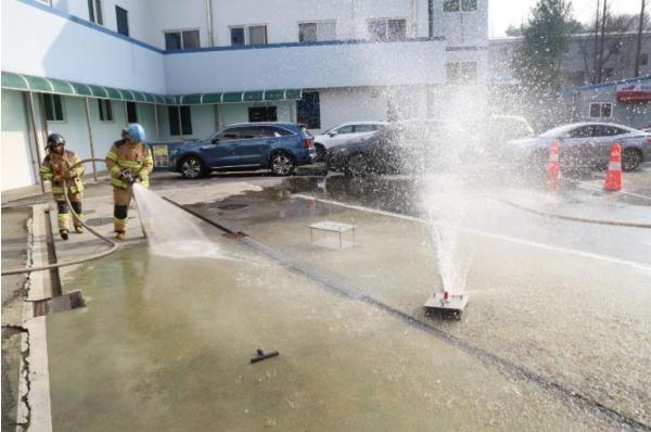 홍성소방서, 전기차 배터리 화재 대응 위해 드릴렌스 훈련 실시