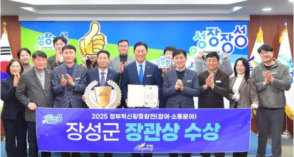 [한국제일신문, 윤진성기자] 장성군이 ‘정부혁신 왕중왕전’ 국민과 함께 만드는 참여·소통 혁신분야에서 행정안전부 장관상을 수상했다.
