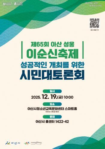 (재)아산문화재단은 ‘'제65회 아산 성웅 이순신축제'의 성공적인 개최를 위한 시민 대토론회’를 오는 19일에 아산시청소년교육문화센터 스마트홀에서 연다.
