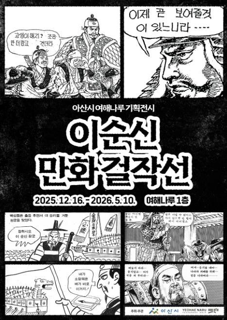 아산시 여해나루 ‘이순신만화걸작선’은 충무공 이순신 순국 제427주기를 기념하는 특별전으로 이번 달 16일부터 2026년 5월 10일까지 여해나루 1층 미디어아트홀에서 개최된다.