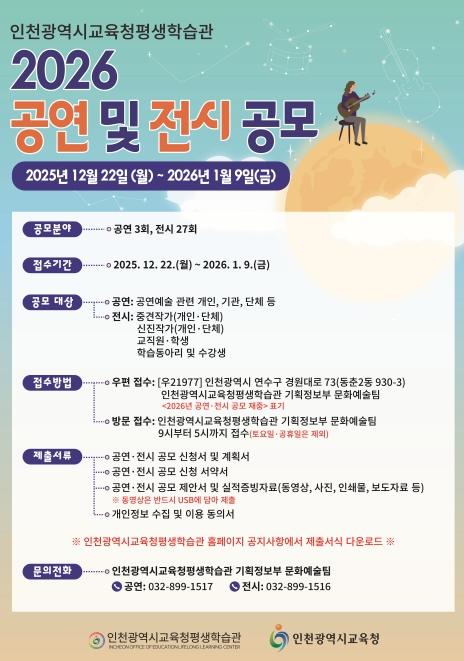 [한국제일신문, 김성옥기자] 인천광역시교육청평생학습관은 시민에게 수준 높은 문화예술 콘텐츠를 제공하기 위해 2026년 공연 및 전시 작품을 공모한다.