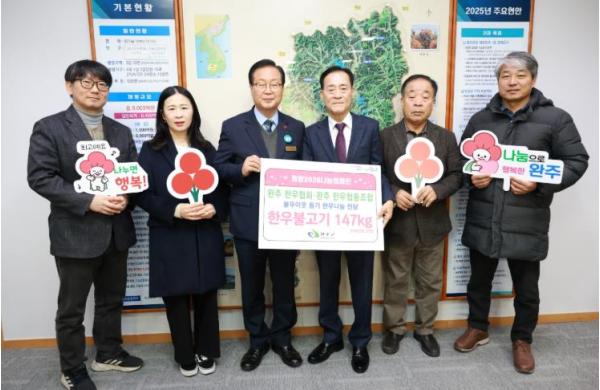 [한국제일신문, 김성관기자] 전국한우협회 완주군지부·완주한우협동조합가 희망2026 나눔 캠페인을 맞아 지역 사회의 이웃들을 돕기 위해 500만 원 상당의 소불고기용 한우 147kg을 완주군에 기부했다.