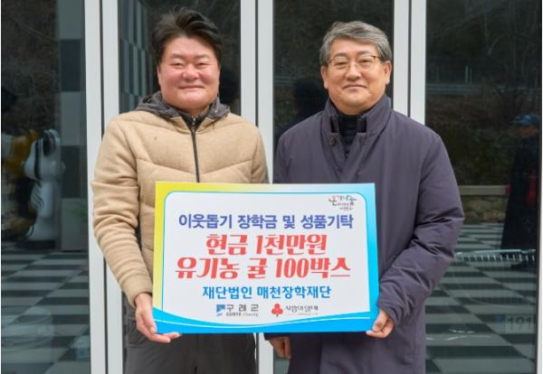 [한국제일신문, 윤진성기자] 전남 구례군은 지난 14일, (재)매천장학재단(이사장 김용목)이 지역 내 저소득가정 학생들을 위한 장학금 1,000만 원과 유기농 귤 100박스를 기탁했다고 밝혔다.