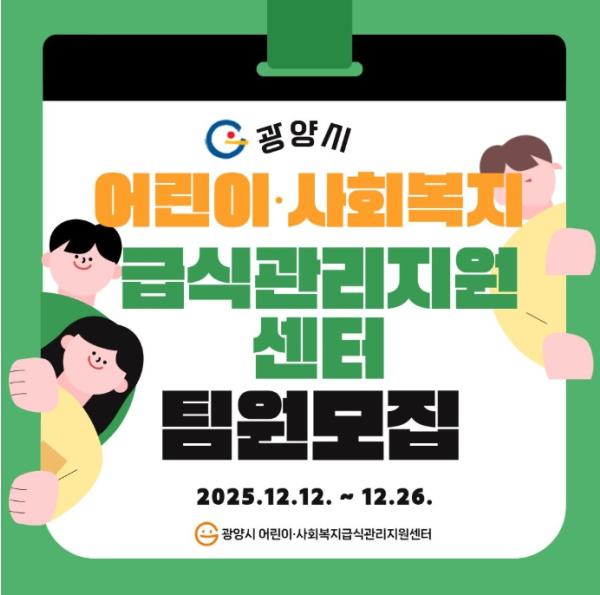 [한국제일신문, 윤진성기자] 광양시 어린이·사회복지급식관리지원센터는 어린이 급식소와 노인‧장애인 사회복지시설의 위생‧안전 및 영양관리 서비스를 강화하기 위해 전문성을 갖춘 팀원 3명을 공개 채용한다고 밝혔다.