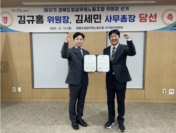 김규홍-김세민 당선자는 제11기 경북도청공무원노동조합에서 사무총장과 사무차장을 각각 역임했으며, 앞으로 2년간(2026.2.1.~2028.1.31.) 제12기 경북도청공무원노동조합을 이끌게 된다.