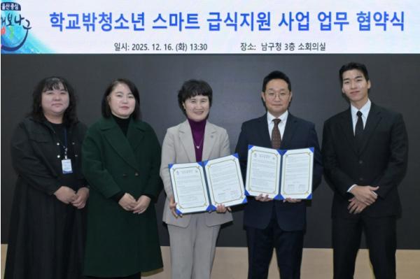 [한국제일신문, 김성옥기자] 울산 남구는 지역 최초로 학교 밖 청소년 급식지원 활성화를 위해 엔에이치엔페이코(주)와 16일 업무협약을 체결하고 상호 협력 체계를 구축했다.