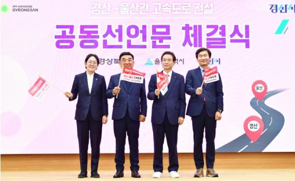 이날 채택한 공동선언문은, 국토교통부가 내년 초 고시 예정인 ‘제3차 고속도로 건설계획(’26~‘30)’에 ‘경산~울산 간 고속도로’를 포함시키기 위한 3개 지자체 간 공동 대응의 일환으로, 본 사업을 통해 △국가 기간산업의 안정성 확보와 지역경제 활성화를 위한 핵심인프라 구축, △국가적 이익 적극 발굴 및 공유, △영남권 상생발전과 국가 균형성장에 기여하기 위한 공동 협력 체계 강화, △본 사업의 필요성과 타당성을 국민과 기업, 지역사회와 함께 공유 등의 내용이 담겼다.