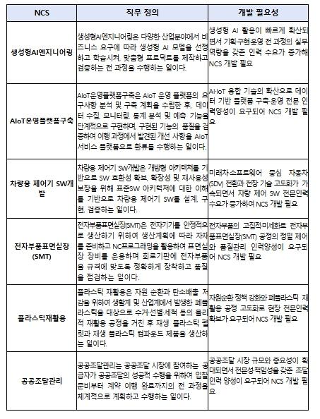 올해는 인공지능(AI) 활용 확산과 융복합 직무 확대에 따라 인력 수요가 늘고 있는 ‘생성형AI엔지니어링’, ‘AIoT운영플랫폼구축’, ‘차량용 제어기 SW개발’ 등 총 6개 직무를 국가직무능력표준으로 개발했다.