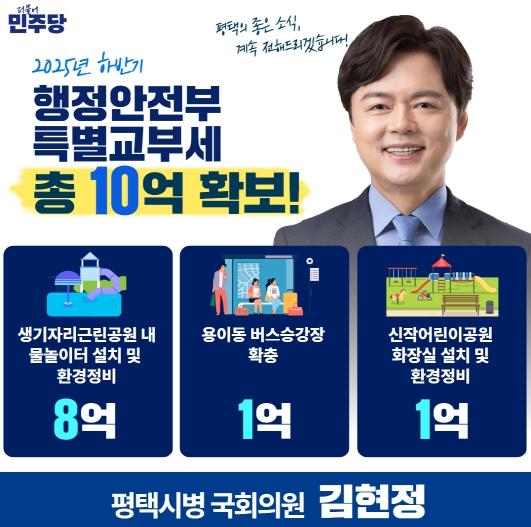 [한국제일신문, 김성옥기자] 김현정 국회의원(평택시병·더불어민주당)은 2025년 하반기 행정안전부 특별교부세 총 10억 원을 확보해, 지역 주민의 생활환경 개선과 안전·편의 증진을 위한 주요 현안 사업을 본격 추진한다고 밝혔다.