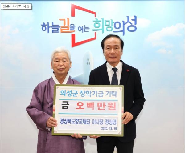 [한국제일신문, 김성옥기자] 재단법인 의성군인재육성재단(이사장 김주수 의성군수)은 지난 12월 10일 경상북도 향교재단 정상영 이사장이 의성군 인재 육성을 위해 장학금 500만 원을 기탁했다고 밝혔다.